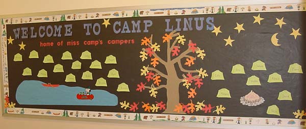 In the hallway outside of Camp Linus, our bulletin board shows a special tent for each scout!