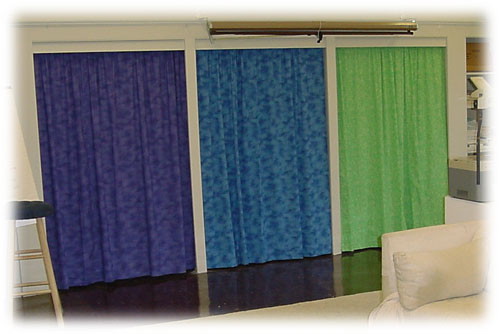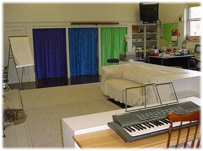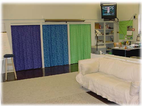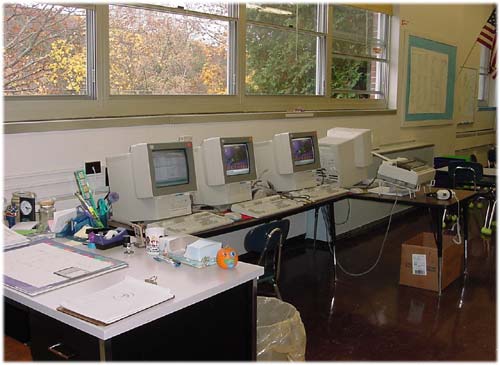 To the right of the curtains, in the corner of the room, is Miss Camp's office :-). Along the next wall, in front of Miss Camp's desk, are our computers.
