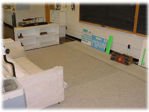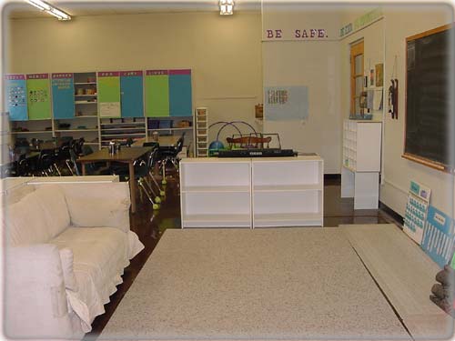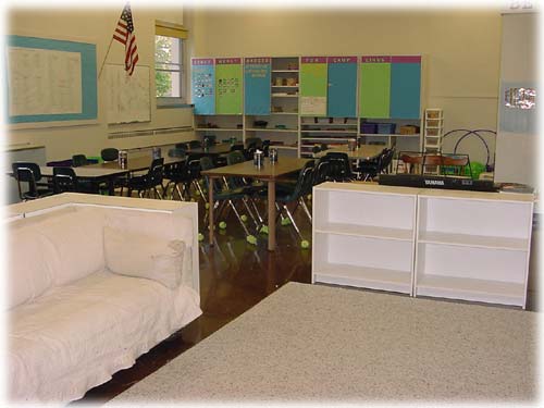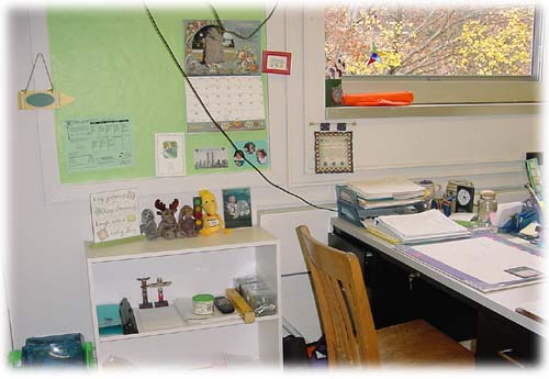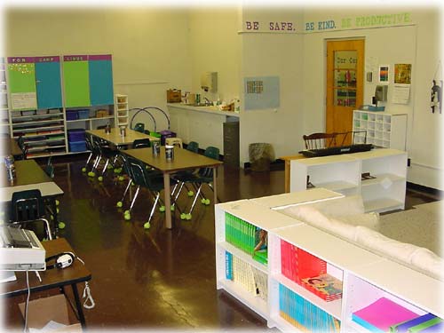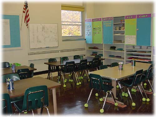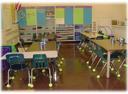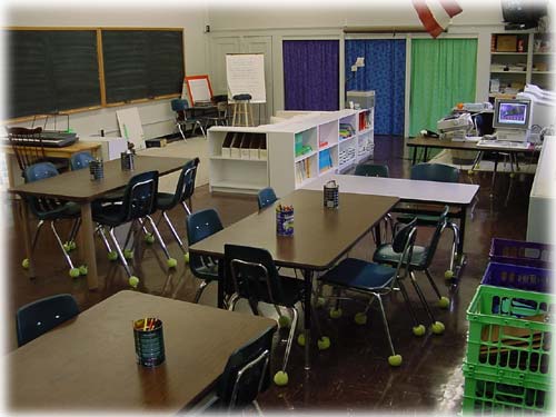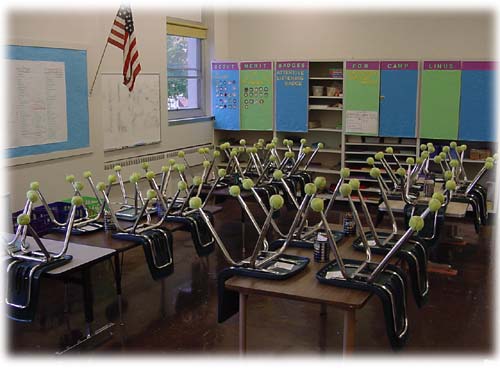 From the corner of the room where the tables are, we look across the room.(The door is to the left, and the windows are to the right.) At the end of the day, we put our chairs up. Do you like our tennis balls?(They help keep the noise level down, and the floor polished!)