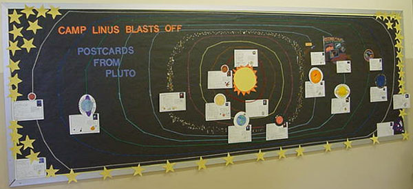 Students tried to include 3 facts and 1 opinion on their postcards. We posted the postcards on the Solar System that is on our bulletin board in the hall outside the classroom. The 9 orbits are made of different colors of yarn, and several of the students created stars that are placed outside our Solar System. (since our Sun is the only star inside our Solar System!) Stop by and see it!