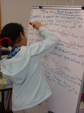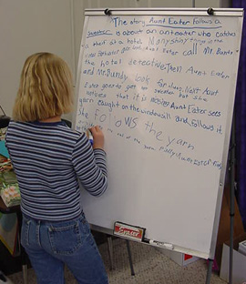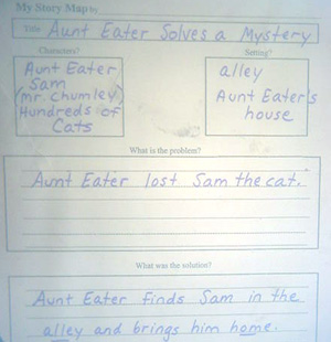 These students are working together to write a one-paragraph summary using the group’s Story Map. (They created the group Story Map by their discussing what they had each written on their individual Story Map.)