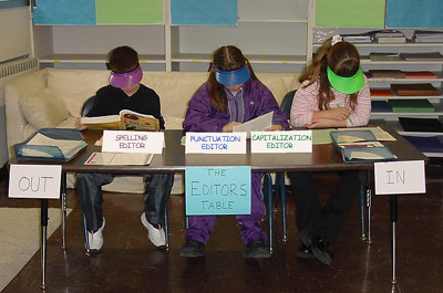 These 3 students are working at The Editors’ Table. On the left is the Spelling Editor. In the middle is the Punctuation Editor. On the right is the Capitalization Editor. Their job is to check the stories written by their classmates (placed in the IN BOX), and to use a checklist that helps them look for and edit any spelling, punctuation, or capitalization errors.