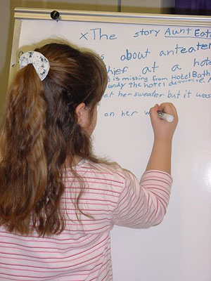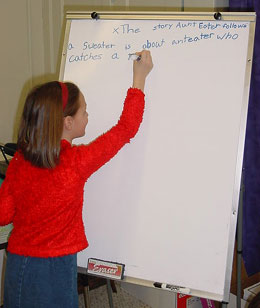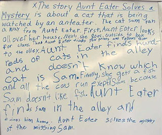 One of the students wrote the Introductory Sentence. Then a different student wrote a sentence stating the problem in the story. After that, the students took turns writing sentences that explained the sequence of events in the story which helped solve the problem. Next one of the students wrote a sentence for the solution. Finally, one student wrote a concluding sentence.