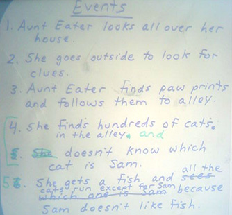 The Problem, Events, and Solution were taken from the group Story Map. The Introductory Sentence and Concluding Sentence were the result of some brainstorming by the group together. When they were done, one student circled all of the “transitional words” (next, first, then, after that, finally, last).