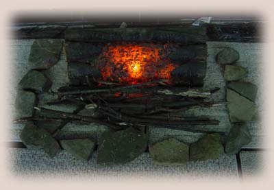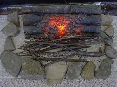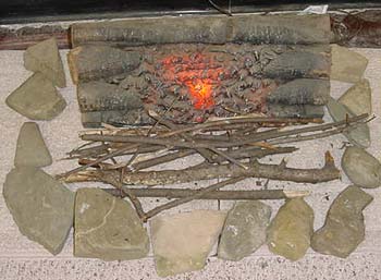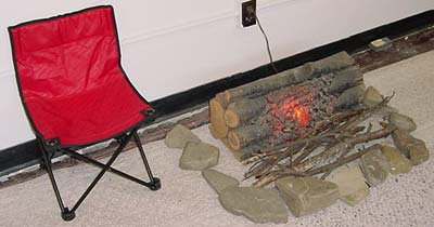 Lenny's dad is lending us a plug-in fireplace-type fire. Hidden behind some sort of resin logs and flames is a red lightbulb and a rotating cylinder made out of something like tin foil. The light on the foil makes it look like the flames are dancing. It's really cool. We put some real sticks in front of it, and then a circle of stones (thanks to Miss Allio!) around the whole thing.