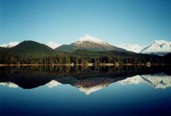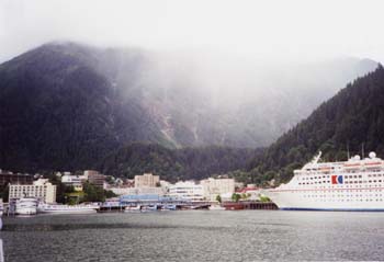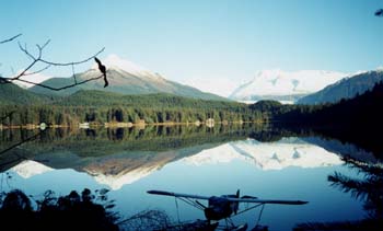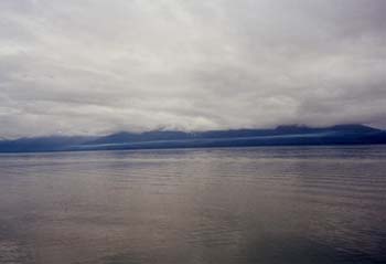 - Also along the Stephens Passage, we passed the major power generating facility for Juneau. We wouldn’t have known it if Lissa hadn’t pointed it out to us. It is built within a mountain. Beyond the mountain are two lakes that we couldn’t see. Long Lake and Crater Lake. Tunnels were dug into the deepest portions of the lake so as to guarantee the greatest pressure, and then punched up through the bottom of the lake. The lake water pours down the hole and through the tunnel into the power facility where it generates electricity as it turns water wheels. This facility generates 85% of the power in Juneau. The only signs of all this activity are the power lines that reach from pole to pole along the mountain sides back to Juneau. Here’s the catch: The Bald Eagle likes to perch within a hundred feet of water and on the highest point possible. An attempt was made to have the poles placed higher up the mountain, but the wind and weather kept knocking them down. So they have to be within 100 feet of