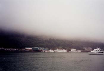 When we left this morning, Juneau was completely enshrouded in fog. We were boating through a total whiteness – both sea and sky the same. The fact that we came out of the fog, had a beautiful view along the Tracy Arm Fjord, and then look to be re-entering the fog as we head back north toward Juneau – that all makes the wonders we saw today so much more magical and mysterious – again that surreal, fairy tale-like quality.