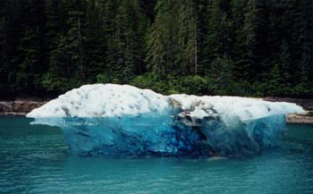 When the ice reaches 500 years old, it is at the end of its life cycle, so to speak, and it breaks off into an iceberg. So icebergs represent ice that is 500 years old. Only 10% of the iceberg is above water. It melts faster below water than it does above water. Blue icebergs are a result of the density of the ice. When ice is at its greatest density, it absorbs all the colors of the spectrum except blue. The blue bounces back to your eye. The older the ice, the more pressure it has been exposed to, and thus the more dense it is. So the more blue the ice, the older it is.